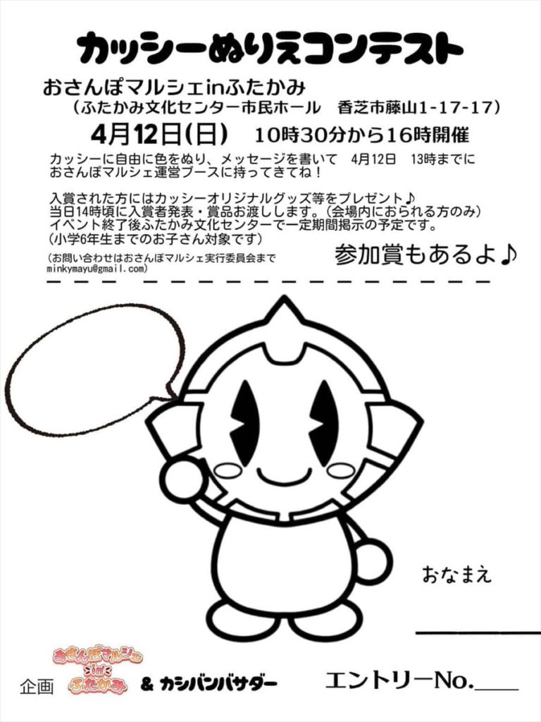 今回のイベントでは、カッシーくんのぬりえコンテストを開催するとのこと。